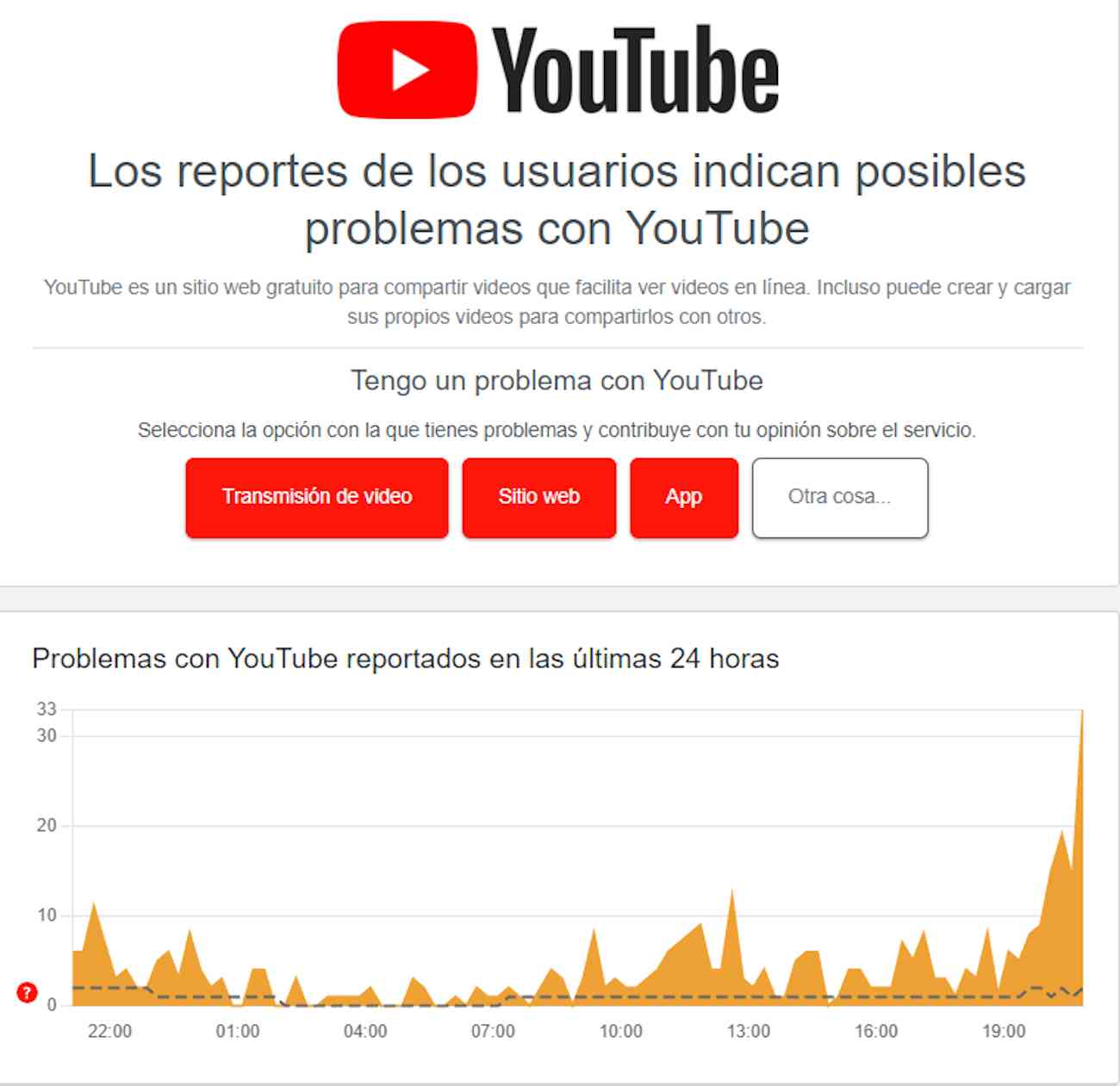 Hasta el momento, la plataforma sigue mostrando errores en la reproducción de vídeos en YouTube con un 69% de fallos. Justamente, ayer le dimos seguimiento desde nuestra página de Facebook y los reportes llegaron hasta el 70%. Seguimos esperando alguna actualización por parte de Google.