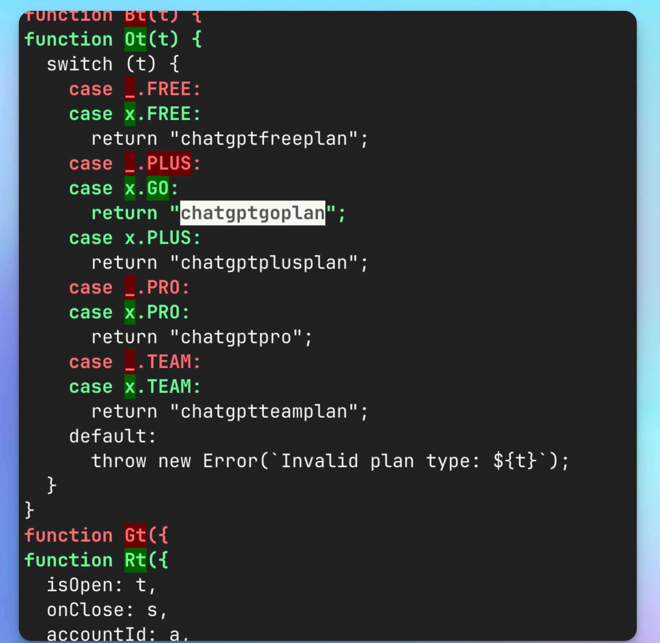 Como se puede ver en la imagen superior, en el código fuente de la aplicación se puede apreciar la línea «chatgptgoplan«, el cual podría ser lanzado en breve. También se aprecian los demás planes, el plan Plus que tiene un costo de 20 euros al mes te ofrece nuevos modelos y algunas funciones extras, también tenemos la versión Pro, este cuesta 200 euros y ofrece acceso a todo y sin limitaciones para explotar la IA.