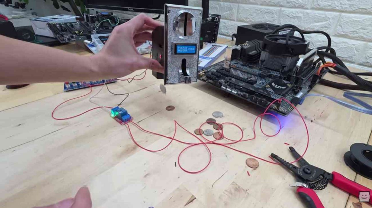 El invento parte de un concepto sencillo, pero brillante. En lugar del clásico botón de encendido del gabinete, el creador sustituyó ese componente por un adaptador de monedas industrial, conectado a la placa de relés y al conector de encendido de la placa base.